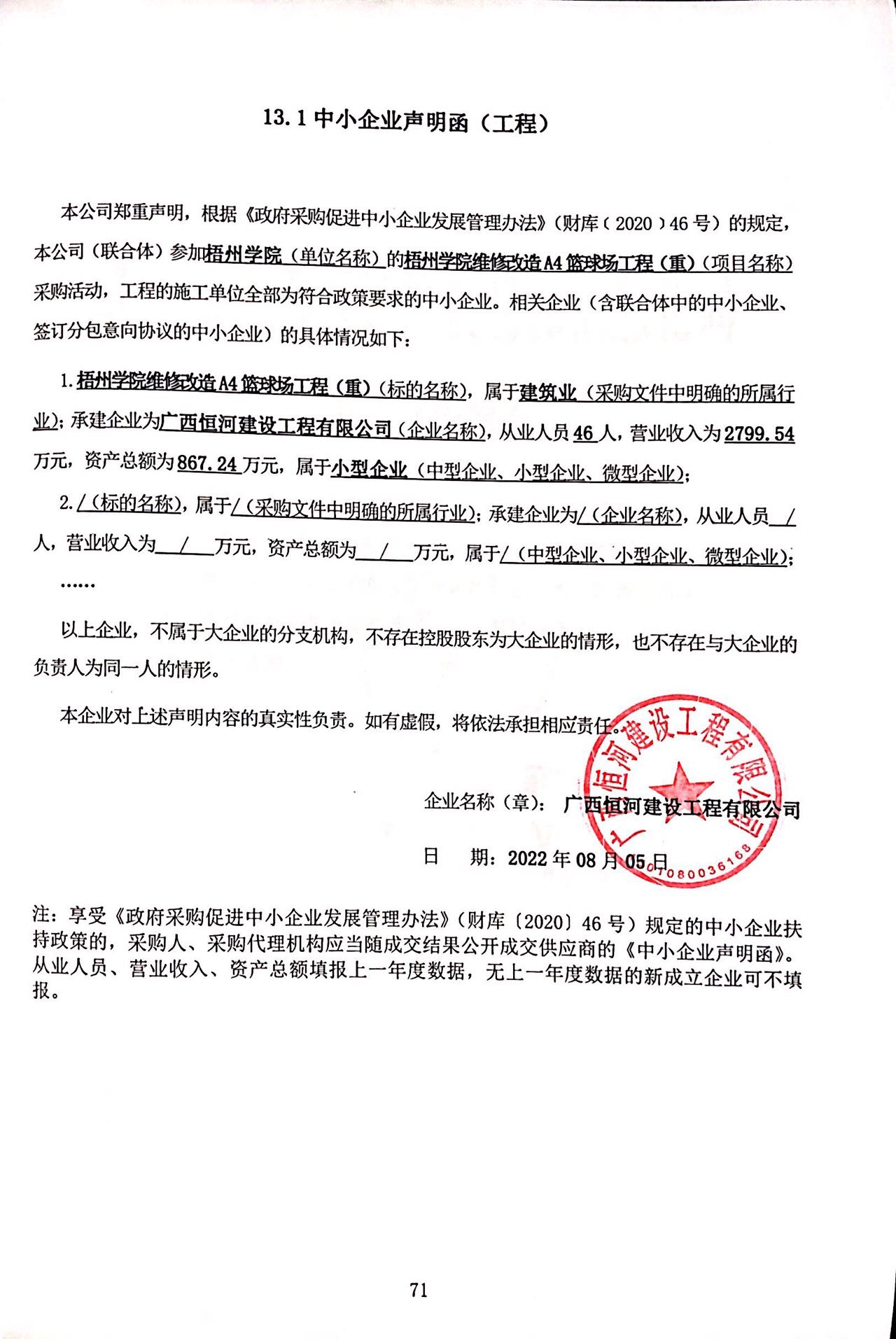名稱:梧州學(xué)院維修改造A4籃球場工程(重) 工程內(nèi)容:梧州學(xué)院維修改造A4籃球場工程一項,項目施工地點位于梧州學(xué)院內(nèi);實施內(nèi)容包括:維修改造A4籃球場,對周邊地面硬化、綠化工程,拆除暗溝、圍擋以及籃球場涂料等內(nèi)容。具體內(nèi)容詳見采購人發(fā)出的工程量清單及圖紙。 工期(合同履約期):90日歷天 |