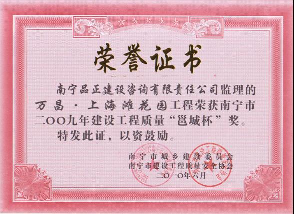 2010年6月,南寧品正負(fù)責(zé)監(jiān)理的南寧市南站南側(cè)路工程C標(biāo)、E標(biāo)、南寧市江南堤路園項(xiàng)目市政工程道路施工1#標(biāo)、南寧市精品線路綜合整治工程(一期)B標(biāo)、南寧市五象廣場(chǎng)周邊區(qū)域市政設(shè)施綜合整治工程I標(biāo)工程、南寧市五象廣場(chǎng)周邊區(qū)域市政設(shè)施綜合整治工程I標(biāo)、南梧大道工程(高速環(huán)二塘收費(fèi)站到三塘下丹橋)NO.7標(biāo)段、萬昌·上海灘花園工程、廣西明陽工業(yè)園啟動(dòng)區(qū)道路工程III標(biāo)等多個(gè)工程分別榮獲南寧市城鄉(xiāng)建設(shè)委員會(huì)、南寧市建設(shè)工程質(zhì)量安全協(xié)會(huì)頒發(fā)的南寧市2009年建設(shè)工程質(zhì)量“邕城杯”獎(jiǎng)。